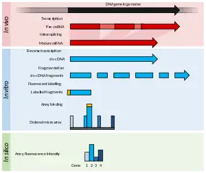 Los microarrays consisten normalmente de una gradilla de oligómeros cortos de nucleótidos, llamados sondas y típicamente organizados en un portaobjetos de vidrio.[53] La abundancia de transcritos se determina por hibridación de los transcritos marcados por fluorescencia a estas sondas.[54] La intensidad de la fluorescencia en cada sonda del array indica la abundancia del transcrito para la secuencia de esa sonda.[54] Se puede diseñar grupos de sondas para medir el mismo transcrito (por ejemplo, hibridando un transcrito en específico en diferentes posiciones) y suelen denominarse "conjuntos de sondas".