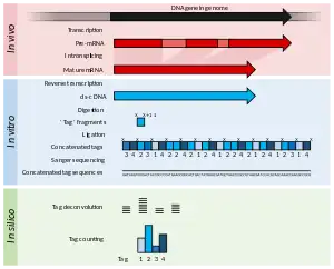 El análisis en serie de la expresión génica (SAGE) se desarrolló a partir de la metodología de ESTs para incrementar el rendimiento de los marcadores generados y permitir la cuantificación de la abundancia de transcritos.[21] El ADNc se genera a partir del ARN, pero luego se digiere en fragmentos "marcadores" de 11 pares de bases, mediante enzimas de restricción que cortan el ADN en secuencias específicas. Entonces, las secuencias se dividen de nuevo en sus fragmentos originales de 11 pares de bases mediante un software de computación, en un proceso llamado deconvolución.[21] Si existe un genoma de referencia de alta calidad, estos marcadores se pueden emparejar con su gen correspondiente en el genoma. Si no existe un genoma de referencia, los marcadores se pueden utilizar directamente como marcadores diagnósticos si se encuentran expresados diferencialmente en un estado de enfermedad.[21]