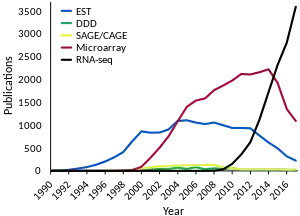 El ARN-Seq se puede utilizar para identificar genes en un genoma o para identificar qué genes están activos en un momento concreto en el tiempo. El conteo de lecturas se puede utilizar para modelizar de manera precisa los niveles relativos de expresión génica. La metodología del ARN-Seq ha mejorado continuamente, principalmente por el desarrollo de tecnologías de secuenciación de ADN para incrementar el rendimiento, precisión y longitud de lectura.[61] Desde las primeras descripciones en 2006 y 2008,[40][62] el ARN-Seq se ha adoptado rápidamente y superó a los microarrays como la técnica dominante en transcriptómica en 2015.[63]