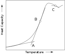 Consulte la figura de la derecha que representa la capacidad calorífica en función de la temperatura. En este contexto, Tg es la temperatura correspondiente al punto A en la curva. Las secciones lineales debajo y arriba de Tg son de color verde. Tg es la temperatura en la intersección de las líneas de regresión rojas.[21]