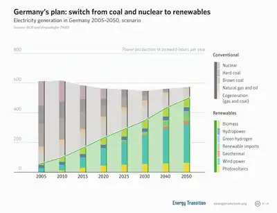 Un ejemplo de transición hacia la energía sustentable es el cambio de Alemania (Energiewende, en alemán)[32] a la energía renovable descentralizada y a la eficiencia energética. Aunque hasta ahora a través de estos cambios se haya estado reemplazando la energía nuclear, el objetivo declarado de estos países —fijado en 2012— fue la eliminación del carbón, la reducción de las fuentes de energía no renovable[33] y la creación de un sistema energético en base a un 60 % de energía renovable para 2050.[34] A partir de 2018, los objetivos de la coalición 2030 incluyen lograr en Alemania un 65 % de energías renovables en la producción de electricidad hasta 2030.[35]