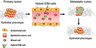 El inicio de la metástasis requiere invasión, permitida mediante la EMT.[21] Las células cancerosas de los tumores primarios pierden sus adhesiones intercelulares por una represión de E-cadherinas y la ruptura de la membrana basal, incrementando así las propiedades invasivas y permitiendo el ingreso al flujo sanguíneo por intravasación. Después, cuando estas células tumorales circulantes (CTCs) se salen de los vasos sanguíneos y forman micro-metástasis, pasan por la MET y crecimiento clonal en zonas metastáticas.[22] Se puede apreciar entonces que la EMT y la MET están al inicio y al final del proceso de metástasis.