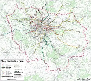 Las líneas del RER (salvo la línea E) tienen la particularidad de atravesar París evitando correspondencias a los usuarios según su recorrido. Transilien explota las líneas de RER gestionadas por la SNCF, esto es, las líneas C, D y E enteras, La línea A, entre Nanterre-Préfecture y Cergy-Le Haut o Poissy y la línea B en la mitad septentrional (al norte de Gare du Nord).