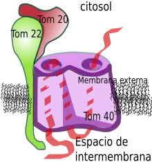 La translocasa de la membrana externa es un complejo formado por, Tom22, y Tom20, junto con Tom40, Tom7, Tom6, y Tom5. Tom20 y Tom22 son los receptores de la preproteína, que son responsables del reconocimiento de la presecuencia escincible que poseen las proteínas etiquetadas para el compartimento mitocondrial.[9] Tom70 también es un receptor de la preproteína y podría reconocer algunas presecuencias escindible, aunque principalmente es responsable del reconocimiento de proteínas no escindibles y actúa como un punto de unión a chaperonas.[10][6] Tom22 está anclada a la membrana externa por un único segmento de transmembrana y también juega un papel en la estabilización del complejo TOM.[11] Tom40 es el elemento nuclear de la translocasa y se acompleja con Tom22 con una masa de aproximadamente 350 KDaltons.[12] Forma el canal central de conducción de la proteína con un diámetro de aproximadamente 2.5 nm.[12] El Tom22 humano tiene aproximadamente 15.5k KDaltos y se acompleja con Tom20.[13] El extremo N-terminal de Tom22 se proyecta hacia el citosol y está implicado en la unión a la preproteína.[13]