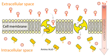 En el transporte activo secundario, también conocido como transporte acoplado o cotransporte, se utiliza energía para transportar moléculas a través de una membrana; sin embargo, a diferencia del transporte activo primario, no hay acoplamiento directo de ATP . En su lugar, se basa en la diferencia de potencial electroquímico creada por el bombeo de iones dentro y fuera de la celda.[15] Permitir que un ion o una molécula se mueva a favor de un gradiente electroquímico, pero posiblemente contra el gradiente de concentración donde está más concentrado hacia donde está menos concentrado, aumenta la entropía y puede servir como fuente de energía para el metabolismo (por ejemplo, en la ATP sintasa). La energía derivada del bombeo de protones a través de una membrana celular se utiliza con frecuencia como fuente de energía en el transporte activo secundario. En los seres humanos, el sodio (Na+) es un ion comúnmente cotransportado a través de la membrana plasmática, cuyo gradiente electroquímico se usa luego para impulsar el transporte activo de un segundo ion o molécula en contra de su gradiente.[16] En bacterias y pequeñas células de levadura, un ion comúnmente cotransportado es el hidrógeno.[16] Las bombas de hidrógeno también se utilizan para crear un gradiente electroquímico para llevar a cabo procesos dentro de las células, como la cadena de transporte de electrones, una función importante de la respiración celular que ocurre en la mitocondria de la célula.[17]