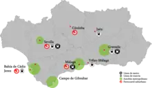 Respecto al transporte ferroviario suburbano, Andalucía cuenta con tres núcleos de cercanías operados por Renfe que dan servicio a las tres mayores aglomeraciones urbanas de la comunidad: el cercanías Sevilla, compuesto por cinco líneas existentes ; cercanías Málaga, con dos líneas; y cercanías Cádiz también con dos líneas.