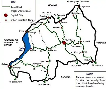 Ruanda tiene un total de 12 000 kilómetros de carreteras, de los que 1 000 kilómetros son pavimentados. El resto son carreteras sin pavimentos con la calidad que varía de superficies lisas difíciles por el drenaje a pistas surcadas, sumamente desiguales accesibles solo con un vehículo de tracción en las cuatro ruedas.