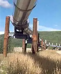 Los oleoductos están hechos de tubos de acero o plástico con un diámetro interior típicamente de 4 a 48 pulgadas (100 a 1220 mm). La mayoría de las tuberías suelen estar enterradas a una profundidad de aproximadamente 3 a 6 pies (0,91 a 1,83 m). Para proteger las tuberías del impacto, la abrasión y la corrosión, se utilizan una variedad de métodos. Estos pueden incluir revestimiento de madera (listones de madera), revestimiento de hormigón, protección contra rocas, polietileno de alta densidad, acolchado de arena importado y máquinas de acolchado.[10]