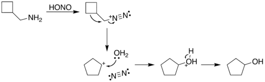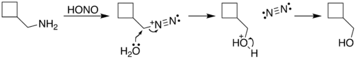 El proceso de reacción comienza con la diazotación de la amina por el ácido nitroso. El grupo diazonio es un buen grupo saliente, que forma gas nitrógeno cuando se desplaza de la estructura orgánica. Este desplazamiento puede ocurrir a través de una transposición (ruta A), en la que migra uno de los enlaces sigma adyacentes al grupo diazo. Esta migración da como resultado una expansión del anillo. El carbocatión resultante es atacado por una molécula de agua. Alternativamente, el grupo diazo puede ser desplazado directamente por una molécula de agua en una reacción SN2 (ruta B). Ambas rutas conducen a la formación de un alcohol con el esqueleto transpuesto.