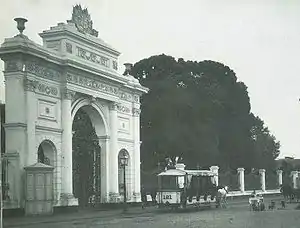 Tranvía de sangre, fabricado en la factoría de la "John Stephenson Co." de Nueva York, frente a la Puerta de Neptuno en el Parque de la Exposición (donde actualmente está el sector denominado parque Neptuno) de la ciudad de Lima, Perú. Fotografía del siglo XIX.