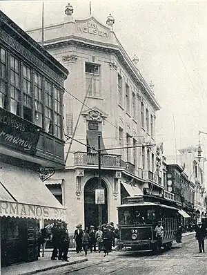 Tranvía eléctrico, fabricado por la "John Stephenson Co." de Nueva York, circulando por el Jirón de la Unión (calle Mercaderes) de la ciudad de Lima, Perú. Fotografía de la década de 1910.