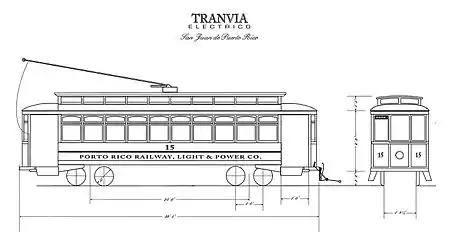 - 1901 - San Juan Light & Transit Co. - El Tranvía eléctrico inaugurado 1 de enero de 1901, apenas 22 años del primer tranvía eléctrico puesto en servicio por Werner von Siemens en Berlín en 1879,[12] el sistema fue retrochado a trocha estándar (1435 mm) y discurría por el mismo trayecto de la Avenida Ponce de León hasta Río Piedras excepto que en el Viejo San Juan serpenteaban a través de la Calle Recinto Sur, Calle San Justo, Calle Tetuán, Calle San José, Plaza de Armas, Calle San Francisco y Plaza Colón. Se ordenaron 17 tranvías eléctricos de pasajeros de doble bogie, bidireccionales, desde los Estados Unidos: diez coches de la American Car Co., de St. Louis, y siete de la John Stephenson Company, de Nueva York.