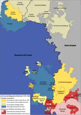 ![]() Bienes atribuidos a Margarita de Austria entre los tratados de Arras (1482) y de Estrasburgo (1505) | ||