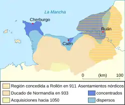 La región se convirtió entonces en un ducado llamado Normandía, de Northmanorum o Nortmanni que significa «hombres del norte», nombre con el que se denominaba a los invasores vikingos. Rollón fue nombrado primer duque de Normandía con el nombre de Roberto I.