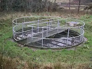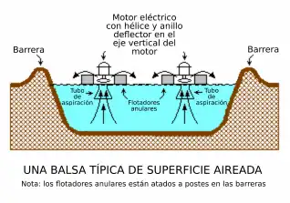 Las lagunas aireadas son un método de tratamiento secundario de crecimiento suspendido de baja tecnología que utiliza aireadores motorizados que flotan en la superficie del agua para aumentar la transferencia de oxígeno atmosférico a la laguna y mezclar su contenido. Los aireadores de superficie flotante suelen tener una capacidad de suministro de aire equivalente a entre 1.8 a 2.7 kg O2/kW·h. Las lagunas aireadas proporcionan una mezcla menos eficaz que los sistemas convencionales de lodos activados y no alcanzan el mismo nivel de rendimiento. La profundidad de las balsas puede oscilar entre 1,5 y 5,0 metros. Las balsas aireadas en superficie consiguen eliminar entre el 80% y el 90% de la DBO con tiempos de retención de 1 a 10 días.[20] Muchos pequeños sistemas municipales de alcantarillado de Estados Unidos (1 millón de galones/día o menos/3785 m3) utilizan lagunas aireadas.[21]