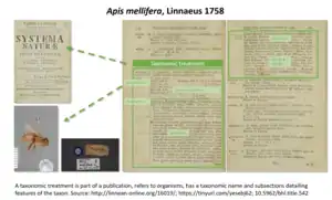 Un tratamiento taxonómico es una sección de una publicación científica que documenta las características de un grupo relacionado de organismos o taxón.[1] Los tratamientos han sido los pilares de cómo se proporcionan los datos sobre los taxones, desde el comienzo de la taxonomía moderna por Linneo en 1753 para las plantas y en 1758 para los animales.[2][3] Cada taxón descrito científicamente tiene al menos un tratamiento taxonómico. En la publicación actual, una etiqueta de tratamiento taxonómico se utiliza para delimitar dicha sección. Permite hacer que esta sección sea localizable, accesible, interoperable y reutilizable con datos FAIR. Esto se implementa en el Repositorio de literatura sobre biodiversidad, donde, tras la deposición del tratamiento, se crea un identificador de objeto digital (DOI) persistente de DataCite. Esto incluye metadatos sobre el tratamiento, la publicación fuente y otros recursos citados, como las figuras citadas en el tratamiento. Este DOI permite vincular el uso de un nombre taxonómico con la respectiva evidencia científica proporcionada por el(los) autor(es).