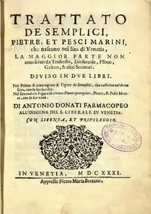 Trattato de' semplici, pietre, et pesci marini, che nascono nel lito di Venezia, la maggior parte non conosciuti da Teofrasto, Dioscoride, Plinio, Galeno, & altri scrittori (Tratado de simples ,[nota 1] piedras y peces marinos que nacen en el litoral de Venecia, en su mayoría desconocidos a Teofrasto, Dioscórides, Plinio, Galeno y otros escritores) es un estudio de la flora propia del litoral de Venecia del boticario veneciano Antonio Donati publicado en 1631 .
