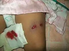 ![]() Una herida por arma de fuego que muestra el orificio de entrada y salida en el muslo izquierdo de una niña de 3 años. | ||