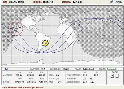 Trayectoria terrestre de la Estación espacial internacional. Las regiones claras y oscuras representan el día y la noche.