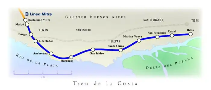 El Tren de la Costa, ubicado en la provincia argentina de Buenos Aires, es un tren ligero turístico, inaugurado en 1995 que recorre 15,5 km atravesando elegantes barrios residenciales en forma paralela al Río de la Plata, entre las estaciones Avenida Maipú, ubicada en la localidad de Olivos y Delta, en Tigre. En su trayecto de 11 estaciones, pasa por los partidos de Vicente López, San Isidro, San Fernando y Tigre.