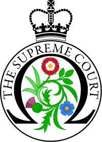 ![]() Escudo de la Corte Suprema. En él está representada la letra omega, que simboliza la finalidad de la Ley, libra, que simboliza las escalas de la Justicia, y por último los emblemas florales del Reino Unido; la Rosa Tudor de Inglaterra, el puerro de Gales, el lino de Irlanda del Norte y el cardo de Escocia. | ||||