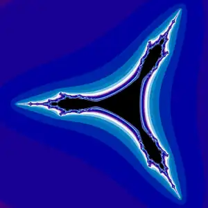 del punto crítico del polinomio antiholomorfo . En analogía con el conjunto de Mandelbrot, el tricornio se define como el conjunto de todos los parámetros para los cuales está limitada la órbita de avance del punto crítico. Esto equivale a decir que el tricornio es el lugar de conexión de la familia de polinomios antiholomórficos cuadráticos; es decir, el conjunto de todos los parámetros para los que el conjunto de Julia es conexo.