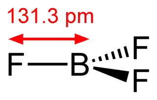 En los trihalogenuros de boro, BX3, la longitud de los enlaces B-F (1,30 Å) es más corto de lo que se esperaría para los enlaces simples,[2] y este acortamiento puede indicar un enlace π B-X más fuerte en el fluoruro. Una explicación fácil involucra el traslape de un orbital p en el átomo de boro, con la combinación enfasada de los tres orbitales p similares de los átomos de flúor, lo que está permitido por la simetría.[2]