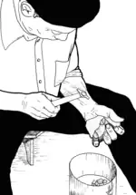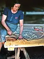 El núcleo (que es un bloque de aristas angulosas, en el caso del sílex, y un canto rodado en el caso de la cuarcita) se sujeta con la mano izquierda, que está protegida de los cortes con pedazo de cuero, con la palma hacia arriba y, con la piqueta en la mano derecha, va dando rápidos golpes. Las lascas, quedan siempre en la palma de la mano izquierda, sobre el protector de cuero, gracias a lo cual, son evaluadas durante décimas de segundo y, si sirven, el briquero las deja caer en una lata, de lo contrario las tira al montón de los desperdicios.[36] A ese mismo montón van los núcleos agotados, es decir, el bloque pétreo que ya no es capaz de producir más; las piezas rotas accidentalmente, las lascas corticales de sílex, los fragmentos inútiles, los debris