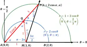 - Segundo, considérese cualquier cuerda del círculo con el ángulo polar . Dado que es un triángulo rectángulo, . El punto correspondiente en el bucle exterior tiene coordenadas , donde .