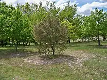 La estructura de la comunidad vegetal a menudo se ve afectada por la disponibilidad de hongos micorrízicos compatibles.[52][53] En los ecosistemas de tierras áridas, estos hongos se vuelven esenciales para la supervivencia de sus plantas hospedantes al mejorar la capacidad de resistir la sequía.[54] Una especie fundamental en los ecosistemas de tierras áridas del suroeste de los Estados Unidos es Pinus edulis, comúnmente conocido como pino piñonero. P. edulis se asocia con los hongos subterráneos Geopora y Rhizopogon.[55]