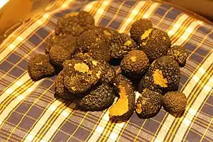 La trufa negra o trufa negra del Périgord (Tuber melanosporum), la segunda especie de mayor valor comercial, lleva el nombre de la región de Périgord en Francia.[27] Las trufas negras se asocian con robles, avellanos, cerezos y otros árboles de hoja caduca y se cosechan a finales de otoño e invierno.[27][28] La secuencia del genoma de la trufa negra se publicó en marzo de 2010.[29]