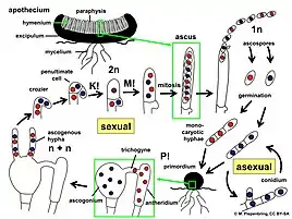 La mayoría de los hongos de la trufa producen esporas asexuales (mitosporas o conidios) y esporas sexuales (meiosporas o ascosporas / basidiosporas).[47] Los conidios se pueden producir más fácilmente y con menos energía que las ascosporas y pueden dispersarse durante eventos de perturbación. La producción de ascosporas consume mucha energía porque el hongo debe asignar recursos a la producción de grandes esporocarpos.[47] Las ascosporas nacen dentro de estructuras en forma de saco llamadas ascos, que están contenidas dentro del esporocarpio.