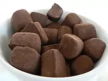 La trufa de chocolate es un dulce francés[1] con aspecto y sabor similar al bombón pero elaborado con una mezcla de chocolate negro fundido (tipo fondant), mantequilla, azúcar glas, yema de huevo y a veces crema de leche.