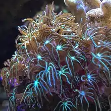 Los pólipos contienen algas simbióticas mutualistas (ambos organismos se benefician de la relación) llamadas zooxantelas. Las algas realizan la fotosíntesis produciendo oxígeno y azúcares, que son aprovechados por los pólipos, y se alimentan de los catabolitos del coral (especialmente fósforo y nitrógeno).[8] Esto les proporciona entre el 70% y el 95% de sus necesidades alimenticias, el resto lo obtienen atrapando plancton y materia orgánica disuelta en el agua.[9]