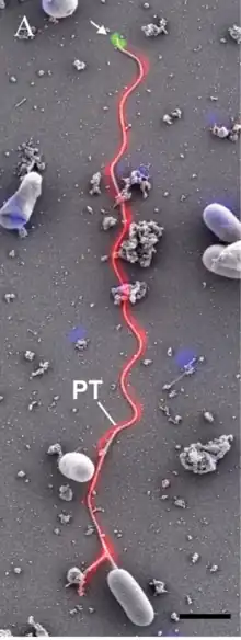 - el segmento lineal del filamento que emana de la punta anterior de la espora y se extiende hacia el extremo posterior, rodeado por el polaroplasto,