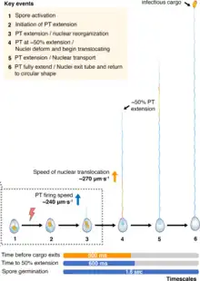 Varias especies de Encephalitozoon tardan menos de 500 milisegundos (ms) en disparar y pasar la carga infecciosa a través del tubo polar. En A. algerae la velocidad con la que extruye el tubo polar es de hasta 300 micrómetros/segundo (μm/s), y necesita 1,6 s para todo el proceso.[7]