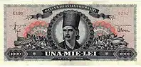 - En junio de 1948, el Banco Nacional de Rumanía, a aproximadamente un año de la denominación de 1947, emitió el billete con el valor nominal de 1.000 lei. Sobre el centro del anverso del billete, se encontraba Tudor Vladimirescu, orientado hacia la izquierda del espectador. A la izquierda y al derecha del retrato se hallaba un arreglo floral y de espigas de trigo (a la derecha del retrato) y mazorcas de maíz (a la izquierda del retrato). Además, a la izquierda del espectador, se hallaba la firma del Gobernador el Banco Nacionales de Rumanía, Aurel Vijoli, y, de forma simétrica, a la derecha del espectador, se hallaba la firma del Cajero Central del banco. Encima al retrato, sobre una rama horizontal, se hallaba grabada la denominación del banco emisor, Banca Națională a României (Banco nacional de Rumania). Bajo el retrato estaba grabado el valor nominal, con las letras UNA●MIE●LEI en el medio y las cifras (1000) a ambos lados de las letras anteriores. Bajo el valor nominal estaba grabada la fecha de emisión del billete, 18 de JUNIO de 1948 . Las series de los billetes fueron impresas con tinta roja, en la parte de arriba del billete.