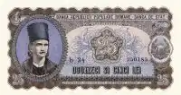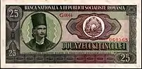 - A principios de 1952, se hizo una nueva reforma monetaria, realizando el cambio de 1 leu nuevo = 20 lei viejos. Aprovechando esta ocasión, fue emitida, junto con los billetes con valores nominales de 1 leu, 3 lei, 5 lei, 10 lei y 100 lei, el billete con un valor nominal de 25 lei, que tenía en la parte izquierda del anverso una imagen de Tudor Vladimirescu, orientado hacia la derecha (del espectador). Justo debajo del retrato fue grabado su nombre TUDOR VLADIMIRESCU. En la parte de arriba del billete, sobre una rama horizontal, fue grabado el texto: BANCA REPUBLICII POPULARE ROMANE ● BANCA DE STAT● (Banco de la república popular rumana Banco del estado).[6] Sobre el centro del billete fue grabado el valor nominal, con las cifras, 25, y debajo, con las letras, DOUAZECI SI CINCI LEI. En la parte derecha del billete fue grabado el escudo de la República Popular Rumana (marzo 1948-1952).[7] En la parte central, pero más abajo, fue grabado el texto: FALSIFICAREA ACESTOR BILETE SE PEDEPSESTE CONFORM LEGILOR. Sobre la misma fila, a la izquierda y a la derecha, fue grabada, con las cifras, el valor nominal del billete, 25. Sobre los billetes de esta emisión faltan las firmas del Presidente del Banco de la República Popular Rumana (la denominación de la época del Gobernador del banco) y del Cajero Central del banco. El color de la tinta con la que se imprimieron los números serie de los billetes de esta emisión es azul oscuro (los billetes imprimidas en Rumanía) o rojo (mucho más raros, los billetes imprimidas en la República Checoslovaca). Las series de los billetes fueron impresas sobre el valor nominal expresado con letras.