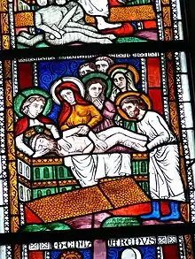 Muy importante es el papel de las Santas Mujeres o Tres Marías, a las que también se denomina miróforas ("portadoras de la mirra"),[34] tanto en el entierro como en la resurrección (pues son las que descubren la tumba vacía).[35]