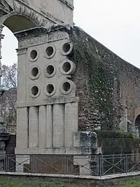 La tumba se construyó alrededor del 30 a. C. Tiene un podio de bloques de toba; la parte superior es de travertino sobre un núcleo de hormigón.