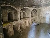 El interior del recinto incluye cuatro cámaras funerarias distribuidas en dos pisos.[14] La más grande, adyacente a la entrada, contiene 13 lóculos (nichos funerarios) arqueados, de 50 x 60 cm cada uno, dispuestos en dos niveles superpuestos, con arcosolios en el nivel superior que dividen los nichos en pares. Otros 9 nichos están ubicados en una segunda cámara, y una docena más se encuentran debajo de las escaleras de la cámara principal, en un espacio del segundo piso.[6] Una cuarta cámara en un tercer piso forma una entidad independiente, con su propia entrada.[11] Los lóculos están dispuestos de manera diferente en cada cámara, estando todas diseñadas para mantener la simetría. En total, se han identificado 63 nichos de entierro en la cueva entera, junto con varios pequeños cubículos y hornacinas para la recolección de los huesos (que en recuentos anteriores puede que se consideraran tumbas propias).[15] Se han encontrado además osarios de piedra en bóvedas excavadas en la roca dentro del complejo.[11]