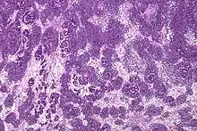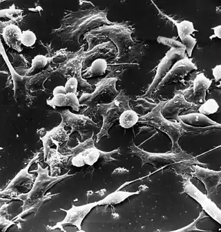 ![]() Células tumorales (las células estrelladas) de un nefroblastoma. Microscopía electrónica. | ||