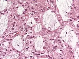 Es parecido a un oligodendroglioma, pero con neuronas visibles.[4] Está inserto en el Grado 1 de la clasificación de tumores cerebrales de la OMS y, generalmente, tiene muy buen pronóstico.[5][6] Macroscópicamente, los tumores son suaves y gelatinosos. Los tumores se pueden formar varios nodos en la corteza y, ocasionalmente, en la cubierta de la sustancia blanca (sustancia blanca) . La región más afectada del cerebro, el lóbulo temporal , seguida por los lóbulos frontales y menos frecuentemente a partir de la corteza parietal . Microscópicamente, la característica más importante es una estructura compleja que consta de glia y neuronas (elementos de los llamados elementos glioneuronal ). Los elementos gliales son filamentos de fibras gliales y vasos sanguíneos. Ellos definen "los lagos de moco", que son en gran medida neuronas maduras.