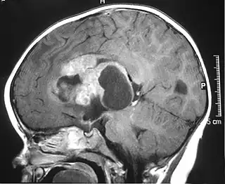 ![]() Imagen de resonancia magnética de un tumor teratoideo/rabdoide atípico (ATRT) supratentorial en un niño. | ||