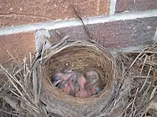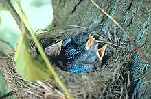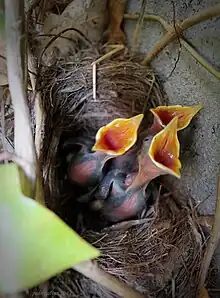 Abandonan el nido muy temprano, entre los diez y los diecinueve días desde su nacimiento (trece días y medio por término medio con un peso de 70 a 80 g). Una semana antes de saber volar salen del nido para dejarse caer revoloteando y esconderse cerca. Seguirán siendo alimentados por sus padres durante tres semanas después de dejar el nido y siguen a los adultos pidiéndoles alimento. Si la hembra comienza una segunda nidada, únicamente el macho se encarga de la alimentación de los jóvenes. Una segunda nidada es bastante común reutilizando el mismo nido si la primera nidada se ha visto coronada por el éxito y en el sur del área de extensión de esta especie puede tener hasta tres generaciones por año o más. Durante el período en que los pequeños son alimentados por sus padres aprenden a elegir sus alimentos. A medida que su experiencia y su confianza aumentan comienzan a aventurarse más en el territorio de sus padres. Los jóvenes acaban por hacerse independientes y marcharse, siempre por su propia iniciativa, nunca son obligados por sus padres.