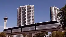 Foto del paso del monorriel de Las Vegas frente a Turnberry Towers Las Vegas. La torre Stratosphere está al fondo.