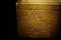 - "(derecha)...El hijo del rey el sacerdote sem Djhutmose; (izquierda) soy el sirviente de este dios noble, su molinero; (frente) Incienso para la Enéada de la necrópolis occidental."[5]