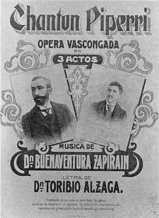 El compositor lekeitiarra Buenaventura Zapirain se había instalado en San Sebastián en 1893, donde trabaja como profesor y organista en el Colegio de los Hermanos Marianistas.[2] Por esa época, la capital guipuzcoana había acogido el estreno de algunas óperas con libreto en euskera (Pudente de José Antonio Santesteban en 1884 o Iparraguirre de Juan Guimón en 1889[3]), pero la obra que compone sobre el texto de Toribio Alzaga es generalmente considerada como "la primera ópera vasca".[4] A diferencia de lo que había sucedido con las óperas anteriores, Txanton Piperri nace con la intención de ser una obra que no se represente sólo en San Sebastián, sino que sea llevada a otras ciudades, difundiendo la cultura vasca en territorios que, a diferencia de San Sebastián, habían sufrido la desvasquización (como en el caso de Bilbao; la capital guipuzcoana mantenía una población culta vascoparlante, por lo que el idioma vasco no tenía una visión de "inculto" que sí tenía en otras ciudades vascas. Zapirain era el primer compositor no guipuzcoano en componer una ópera en lengua vasca, y la obra, lejos de ser un simple entretenimiento para las fiestas de carnaval, como en los casos precedentes, tiene ambiciones de gran ópera histórica, tomando como referente obras internacionales, en especial la Grand-opéra francesa.[5] El argumento de la obra, si bien histórico, tiene una aplicación contemporánea: su mensaje de unidad en medio de la división entre oñacinos y gamboínos en las Guerras de bandos es aplicable a una sociedad recién salida de las guerras carlistas, con alusiones explícitas al lema "Jaungoikoa eta lege zarra" (Dios y fueros), el lema de Sabino Arana, fundador del PNV.[6]