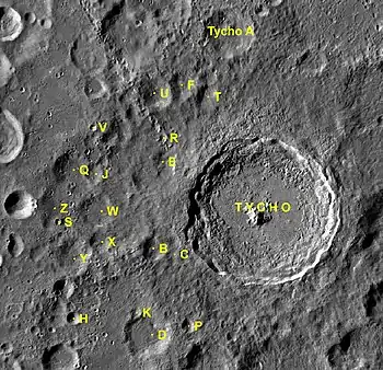 Por convención estos elementos son identificados en los mapas lunares poniendo la letra en el lado del punto medio del cráter que está más cerca de Tycho.