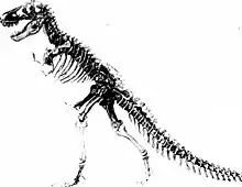 Barnum Brown, el conservador auxiliar del Museo Americano de Historia Natural, encontró el primer esqueleto de T. rex en Wyoming en 1900. Luego encontró otro esqueleto parcial en la Formación Hell Creek en Montana, en 1902, que comprende aproximadamente 34 huesos fosilizados.[19] Escribiendo en ese momento, Brown dijo: "La Cantera No. 1 contiene el fémur, el pubis, el húmero, tres vértebras y dos huesos indeterminados de un gran dinosaurio carnívoro no descrito por Marsh ... Nunca he visto algo así en el Cretácico".[20] El primer espécimen fue originalmente nombrado Dynamosaurus imperiosus en el mismo documento en el que fue descrito Tyrannosaurus rex a partir del segundo.[21] En 1906, Osborn reconoció que los dos esqueletos eran de la misma especie y seleccionó Tyrannosaurus como el nombre preferido.[22] Si no hubiera sido por el orden de las páginas, Dynamosaurus se habría convertido en el nombre oficial. El material original del Dynamosaurus se encuentra en las colecciones del Museo de Historia Natural de Londres.[23] En 1941, el espécimen tipo T. rex fue vendido al Museo Carnegie de Historia Natural en Pittsburgh, Pensilvania, por 7000 dólares.[20] Dynamosaurus, más tarde sería honrado por la descripción de 2018 de otra especie de tiranosáurido por Andrew McDonald y sus colegas, Dynamoterror dynastes, cuyo nombre se eligió en referencia al nombre de 1905, ya que había sido un "favorito de la infancia" de McDonald's.[24]